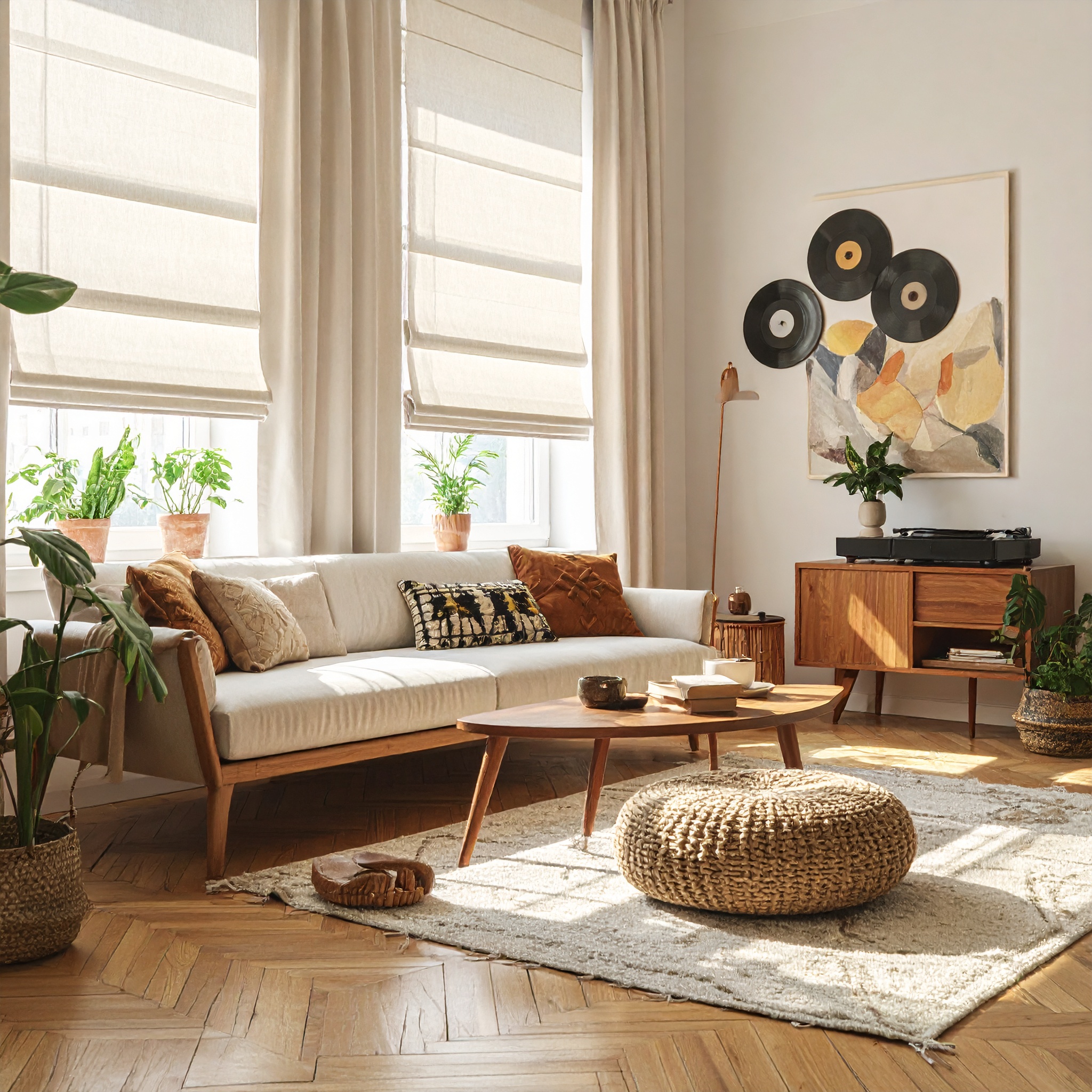 • Style bohème : un store bateau en lin naturel + des rideaux à motifs ethniques.