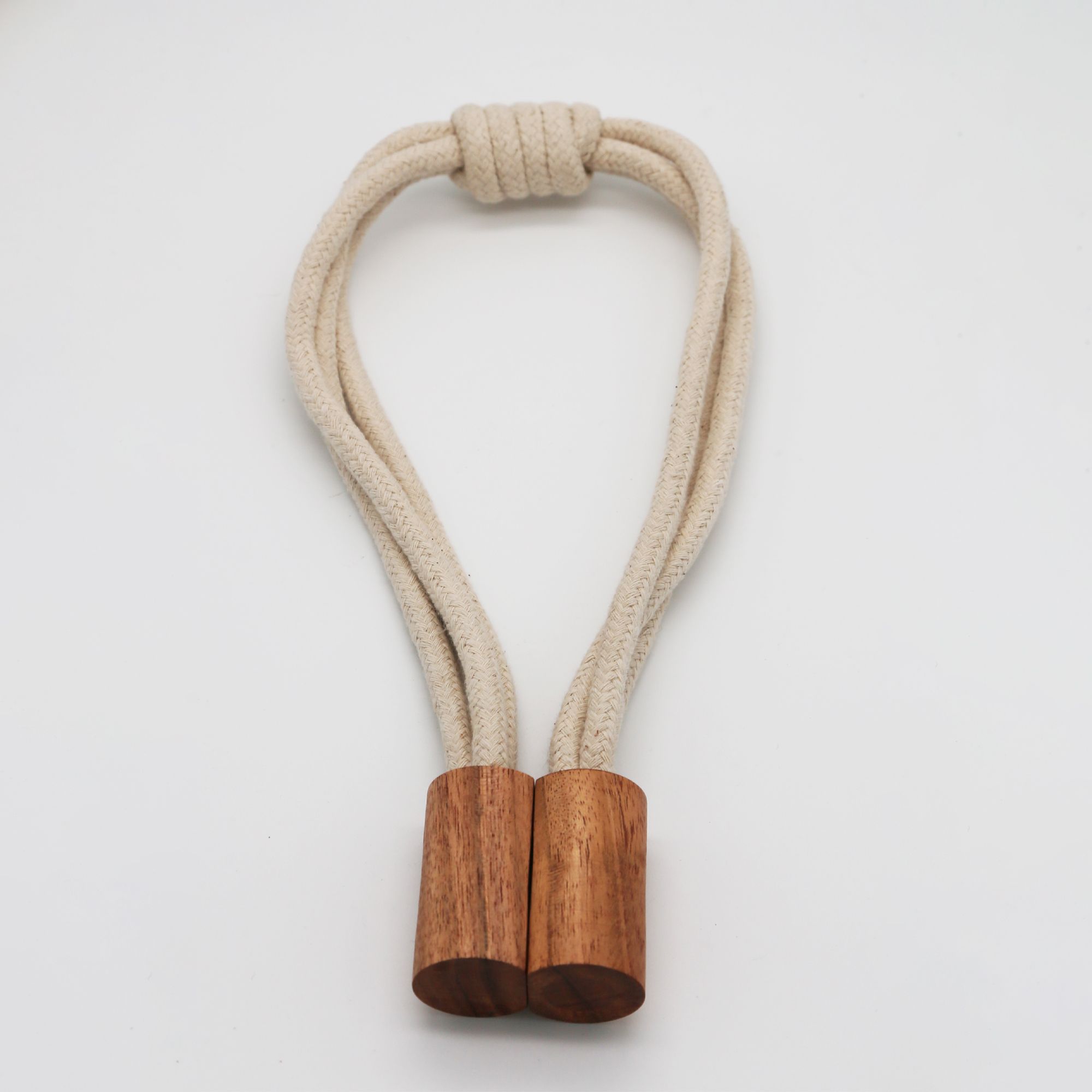 Authentique chic. Alga associe une tresse coton écru non teint à des galets de bois de manguier aimantés. Sa longueur de 60 cm est parfait pour des rideaux plus amples (doubles rideaux, tissus épais).