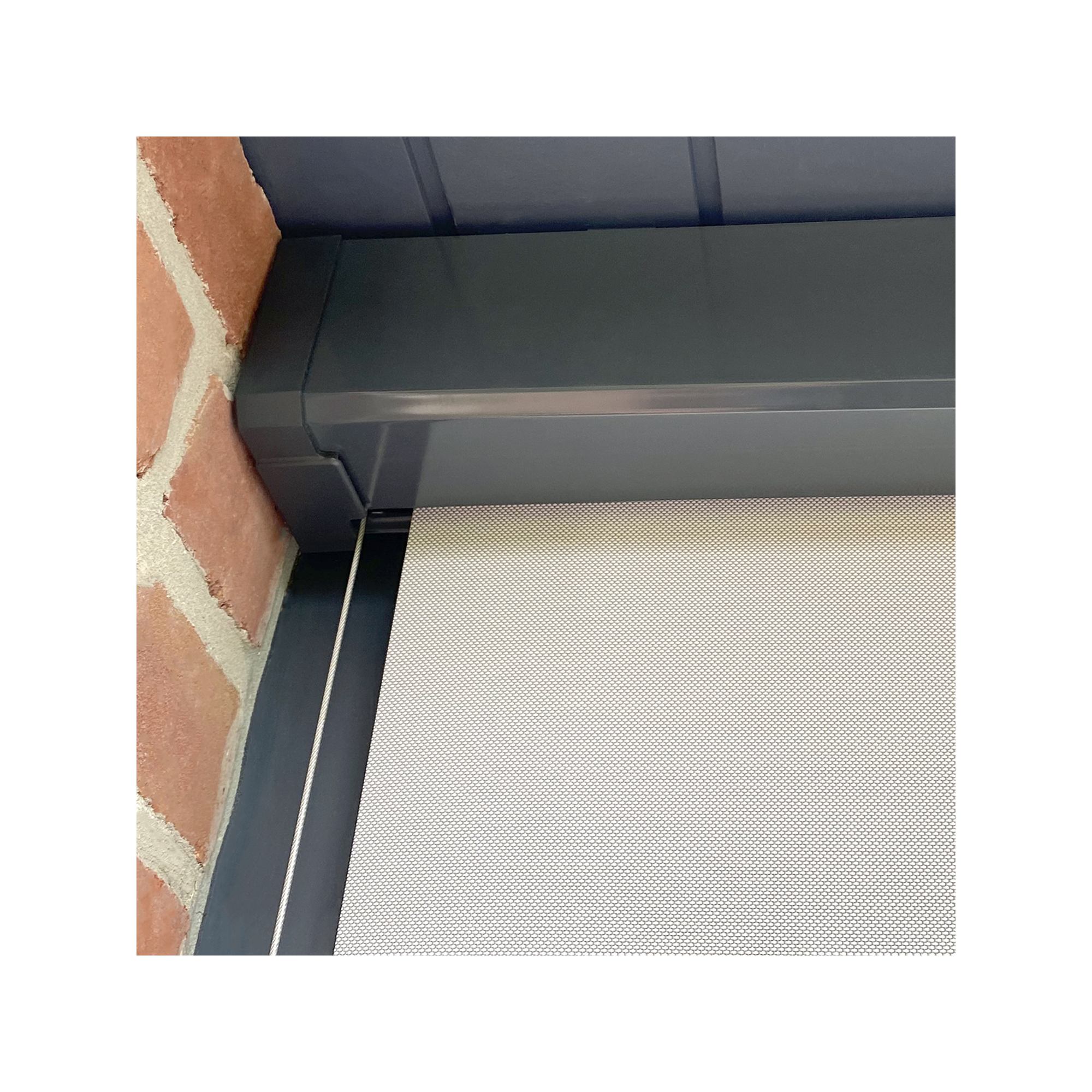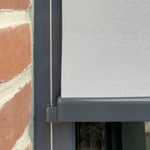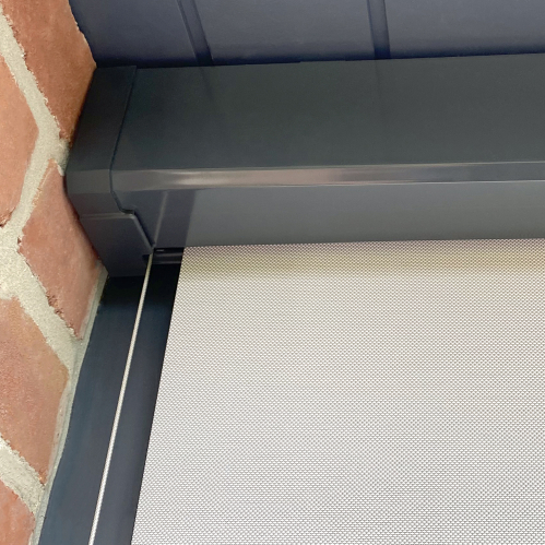 Découvrez le store enrouleur extérieur motorisé gris anthracite avec sa toile en tissu screen, parfait pour l'extérieur. Store avec moteur filaire, manœuvre par inverseur.